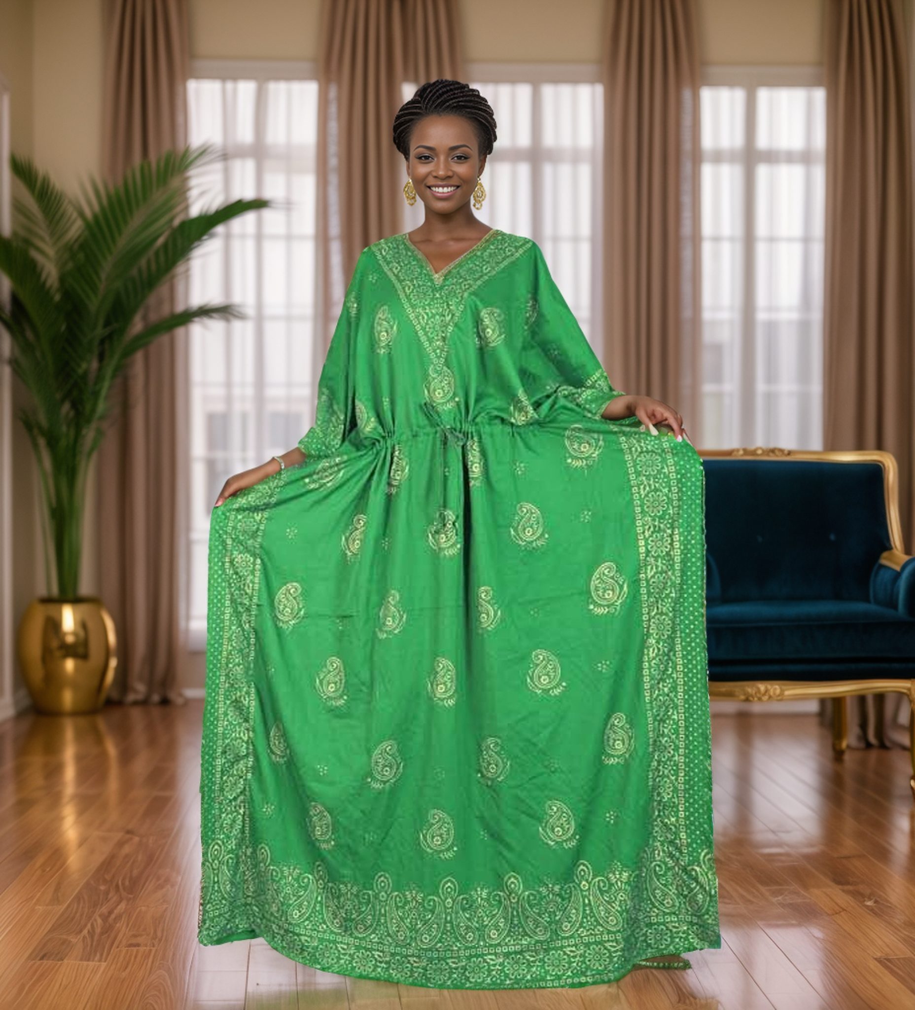 - Dramatic flowing kaftan silhouette with elegant cape-style sleeves