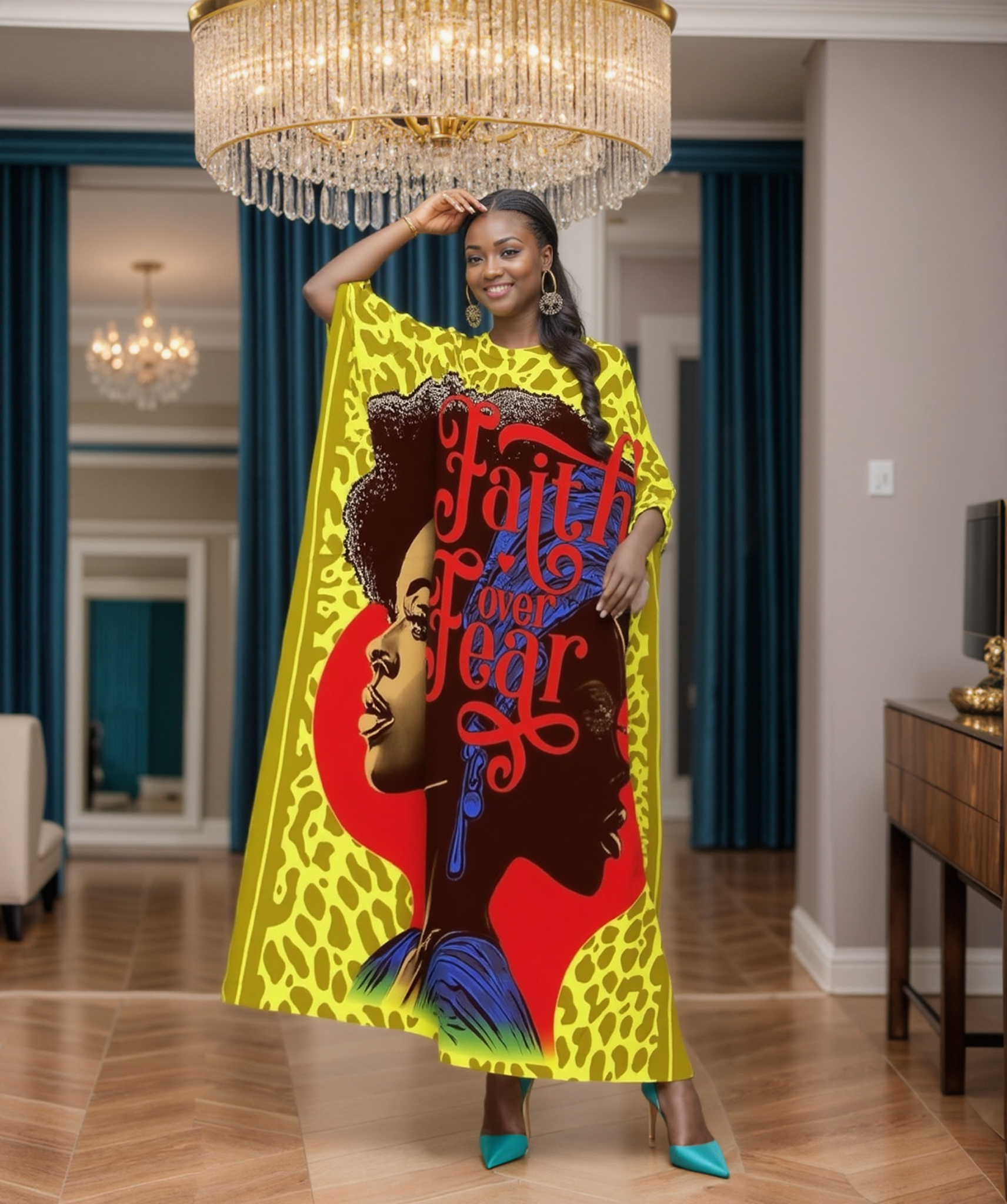 Wear your faith boldly with this inspiring oversized caftan dress featuring an empowering message and stunning artistic design. The combination of vibrant colors, leopard print, and uplifting typography creates a meaningful statement piece that celebrates strength, courage, and beauty.